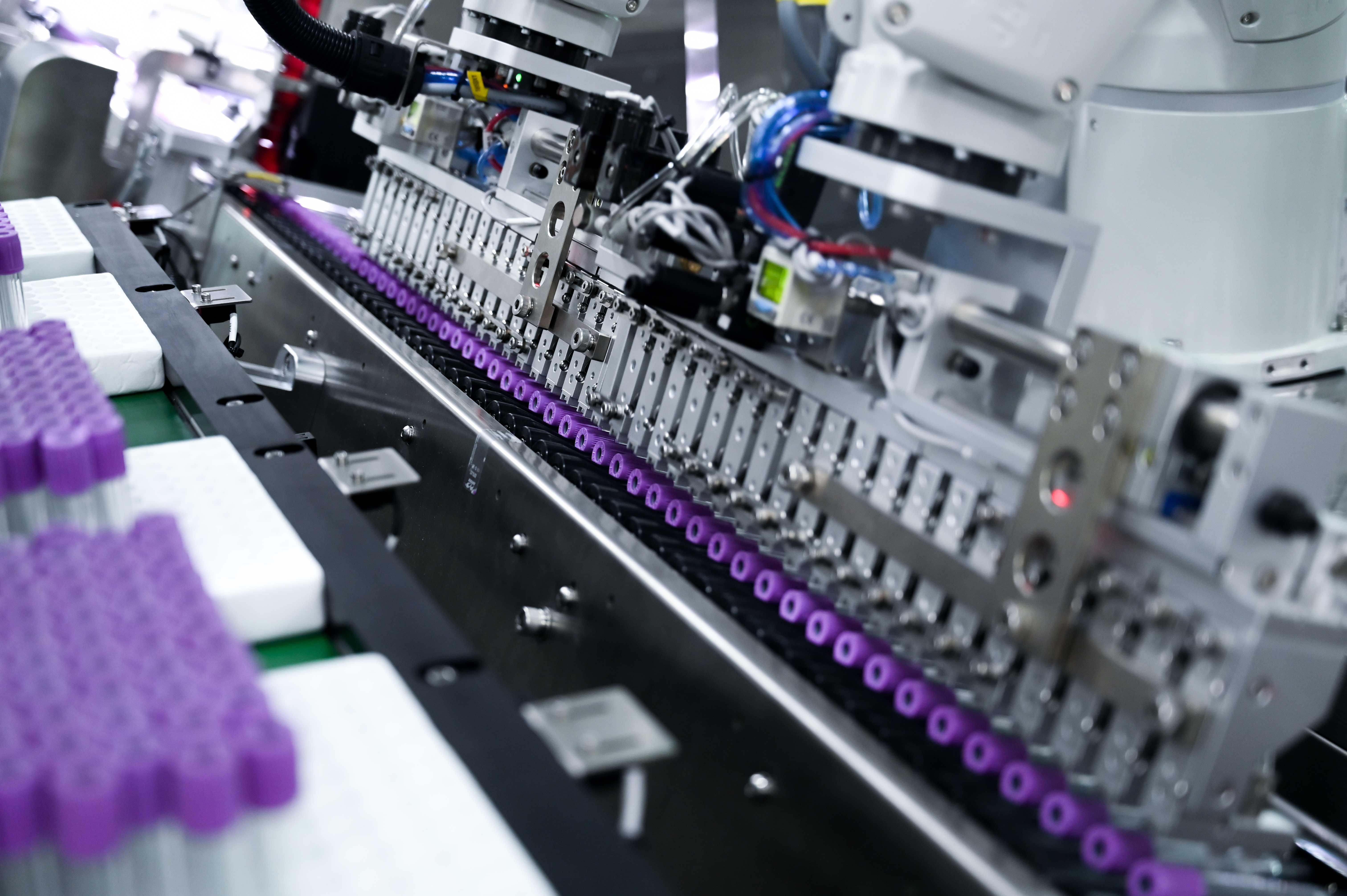 空管上料至成品输出,全流程自动组装作业;设备性价比、稼动率高,模块化设计,结构紧凑;人机界面程序设计人性化,显示多功能报警及辅助排除故障;过程控制、质量受控,空管、倒管、漏管检测、加液动作检测、帽盖到位检测、真空室负压值检测等,对每个工序进行过程控制,合格率高。
